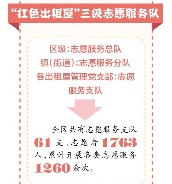 “志愿服務(wù)是我們推進(jìn)出租屋服務(wù)常態(tài)化,引導(dǎo)房東、租客自我管理、自我服務(wù)的重要抓手!痹撠(fù)責(zé)人告訴記者,為進(jìn)一步發(fā)揮志愿服務(wù)在黨建引領(lǐng)出租屋治理和服務(wù)民生中的重要作用,今年以來,全區(qū)各出租屋管理黨支部積極動(dòng)員黨員房東、熱心房東、熱心租客、網(wǎng)格員等加入“紅色出租屋”志愿服務(wù)隊(duì),并推動(dòng)外來工志愿服務(wù)隊(duì)隊(duì)員到所租住的出租屋黨群服務(wù)站報(bào)到。該區(qū)現(xiàn)已建立“紅色出租屋”三級(jí)志愿服務(wù)隊(duì),共發(fā)展志愿者1763人,累計(jì)開展各類志愿服務(wù)1260余次。