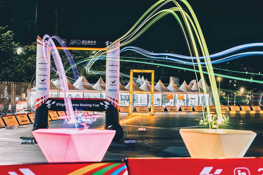 比賽中無人機飛出七彩軌跡;葜萑請笥浾吡蛀惥 通訊員佘海綽 攝