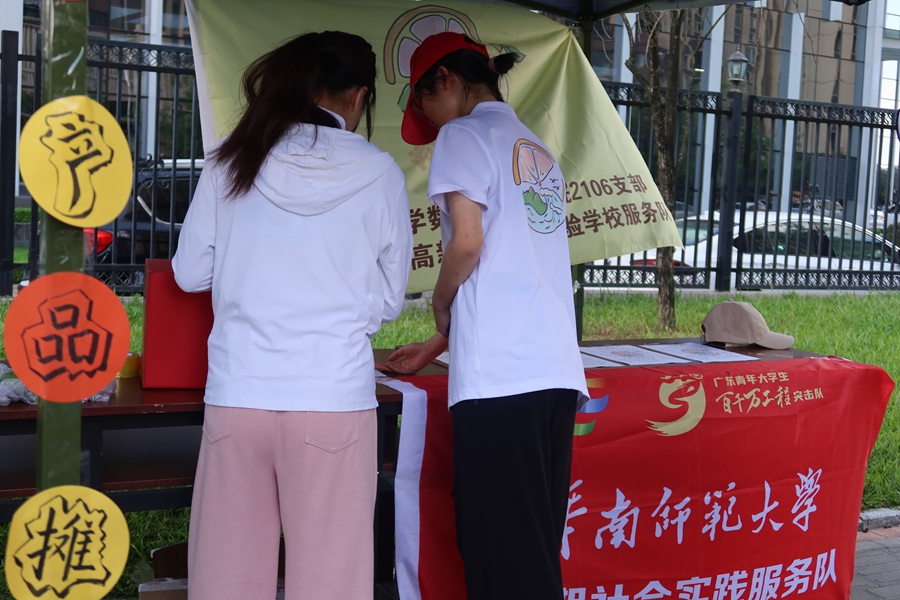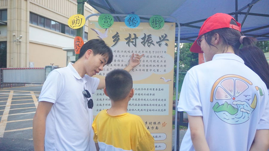 厚植宣傳科普厚土,架起鄉(xiāng)村振興橋梁。7月11日,華南師范大學數(shù)學科學學院夏日柚約暑期實踐隊來到廣東省惠州市仲愷高新區(qū)惠南實驗學校開展“鄉(xiāng)村振興宣傳一條街”科普實踐活動,走進鄉(xiāng)村基層,為鄉(xiāng)村振興注入青年力量,通過自身實踐提高當?shù)鼐用襦l(xiāng)村振興意識,助力鄉(xiāng)村發(fā)展!班l(xiāng)村振興宣傳一條街”活動共設置科普亭、問答屋、助農產品攤三個攤位,通過講解鄉(xiāng)村振興知識、鄉(xiāng)村振興知識問答、贈送優(yōu)質農產品,為當?shù)鼐用駧硪粓鰟e開生面的鄉(xiāng)村振興科普活動。