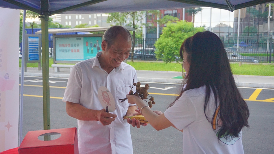晶瑩的龍眼、香甜的芒果、飽滿的香蕉,在助農產品攤上擺放著各式各樣水果,每一位前來觀看科普宣講的居民都可以免費得到。攤位上的水果均是實踐隊成員向惠州當?shù)毓r收購,目的是讓居民品嘗到品質優(yōu)良的水果,“食過返尋味”,向果農購買,以此助農扶農。隊員們在現(xiàn)場拿著水果在攤位上向居民們展示,詳細地介紹了水果的產地和風味。前來攤位的小朋友們還在現(xiàn)場品嘗了龍眼,他們還積極地為助農產品攤做宣傳,“我回去喊我朋友也來吃水果!”