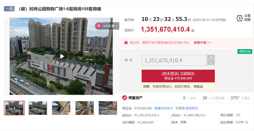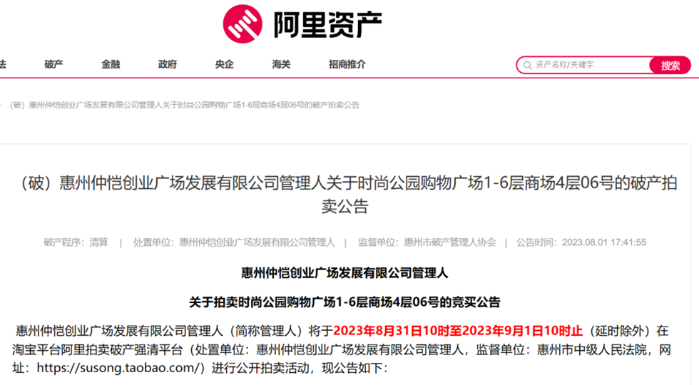 近日,阿里資產(chǎn)平臺(tái)發(fā)布了《(破)惠州仲愷創(chuàng)業(yè)廣場(chǎng)發(fā)展有限公司管理人關(guān)于時(shí)尚公園購物廣場(chǎng)1—6層商場(chǎng)4層06號(hào)的破產(chǎn)拍賣公告》和《時(shí)尚公園購物廣場(chǎng)1~6層商場(chǎng)108套商鋪》拍賣信息,起拍總價(jià)約13.5億元,將在2023年8月31號(hào)進(jìn)行網(wǎng)拍,引發(fā)市民關(guān)注!
