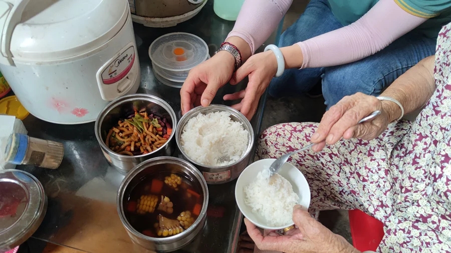 中午11時(shí)許,送餐志愿者劉麗敏剛把飯放下來,就發(fā)現(xiàn)93歲的徐奶奶滿身大汗,于是幫她換衣服,打開風(fēng)扇,然后擰開不銹鋼飯盒蓋,把湯盛到碗里。