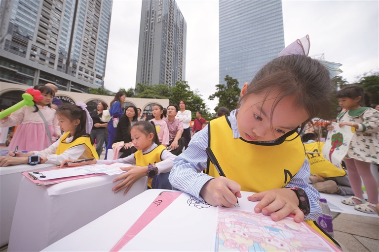 小朋友們現(xiàn)場進(jìn)行美術(shù)創(chuàng)作,描繪自己的城市理想。