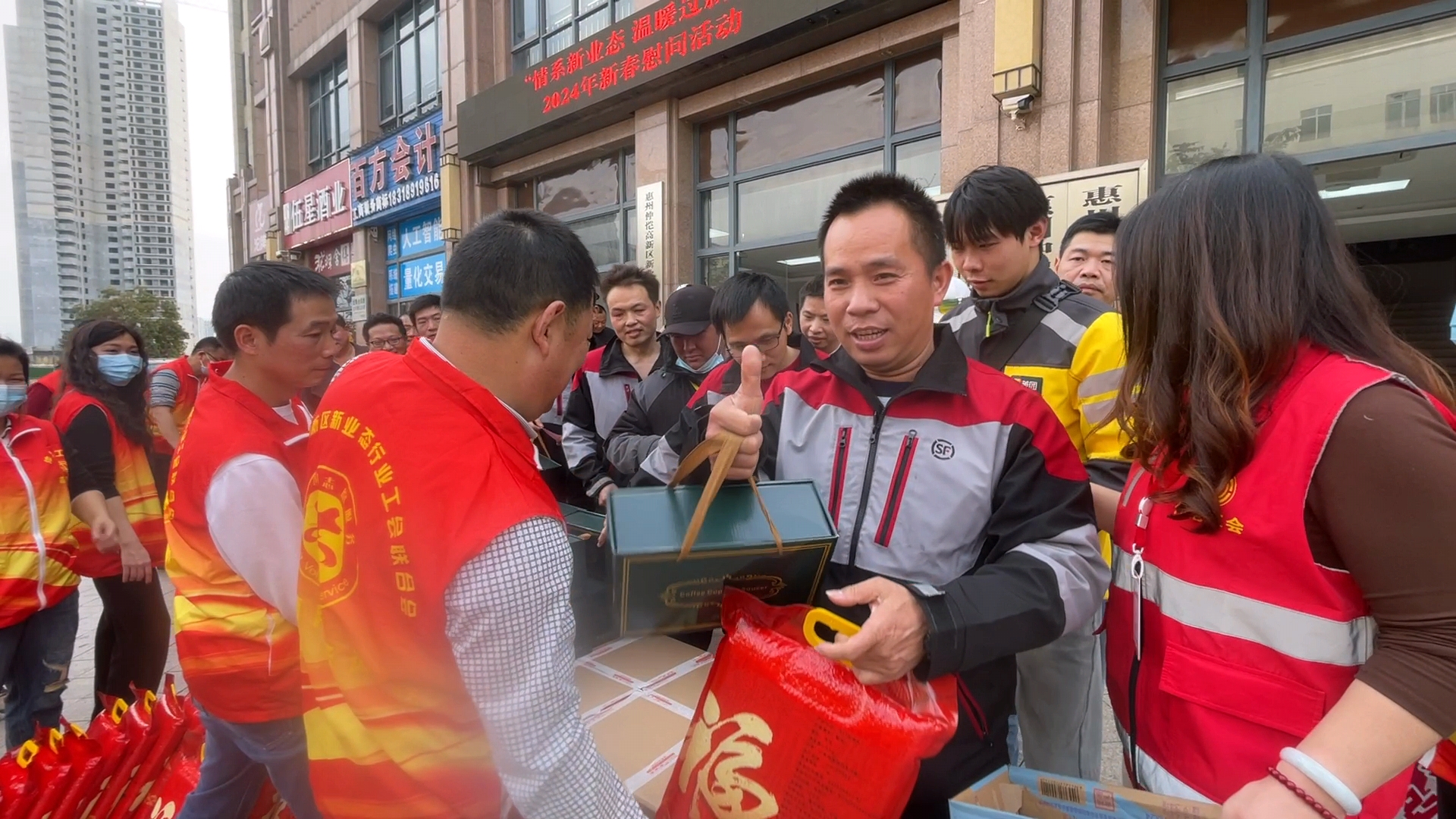 新業(yè)態(tài)勞動(dòng)者高興地領(lǐng)取新春福利。 惠州日?qǐng)?bào)記者邱舒婷 攝