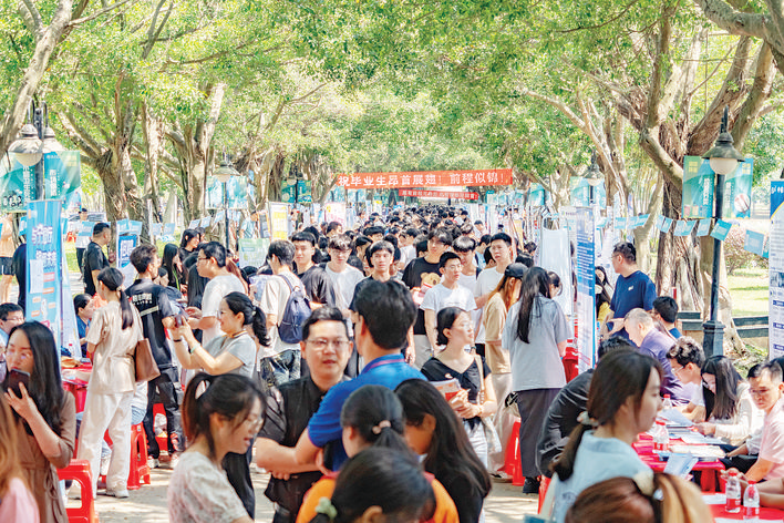 記者在現(xiàn)場看到,長長的林蔭道兩邊擺滿企業(yè)攤位,路上擠滿了學生。“我學的電氣工程及其自動化,和我的專業(yè)匹配的崗位還挺多!贝笏膶W生陳駿杰告訴記者,他希望能夠找到設(shè)備管理類崗位。