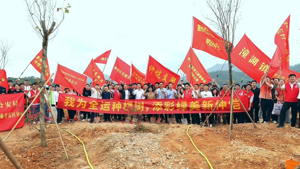 春風(fēng)拂綠,萬物競(jìng)發(fā),正是綠化造林的好時(shí)節(jié)。3月14日,仲愷高新區(qū)潼湖觀洞湖森林公園內(nèi)一片繁忙而有序的景象。遠(yuǎn)處,群山環(huán)抱,綠水繞流;近處,一塊寫著“我為全運(yùn)種棵樹,添彩綠美新仲愷”的橫幅高掛,各區(qū)屬及駐區(qū)單位的紅色大旗鮮艷奪目!吧鷳B(tài)綠”與“熱情紅”構(gòu)成一幅如詩如畫的“綠水青山”美景。這是仲愷高新區(qū)2025年全區(qū)推進(jìn)綠美廣東生態(tài)建設(shè)暨三級(jí)林長(zhǎng)植樹活動(dòng)的現(xiàn)場(chǎng)。