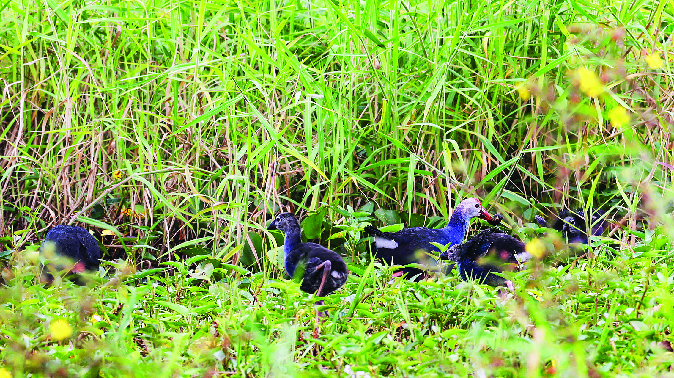 在最新拍攝的畫面中,兩只成年紫水雞帶領(lǐng)三只幼鳥在水草叢中覓食嬉戲。幼鳥體色偏灰褐,與成鳥鮮明的羽色形成對比,絨毛未褪、行動稚拙,這一完整的家庭活動影像,首次證實(shí)紫水雞在潼湖濕地自然繁殖成功。紫水雞被譽(yù)為“世界最美水鳥”,主要分布在非洲、亞洲南部和大洋洲,在我國罕見于西南部地區(qū),多棲息于江河、湖泊周圍的沼澤地和蘆葦叢中。據(jù)觀測,該家庭活動區(qū)域植被茂密、水質(zhì)清澈,成鳥頻繁為幼鳥示范如何啄食水生植物,展現(xiàn)了典型的親子互動模式。