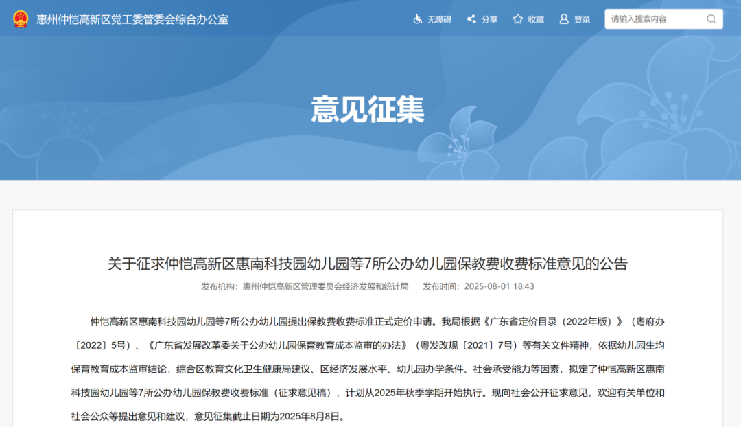 日前,仲愷高新區(qū)管理委員會(huì)經(jīng)濟(jì)發(fā)展和統(tǒng)計(jì)局發(fā)布《關(guān)于征求仲愷高新區(qū)惠南科技園幼兒園等7所公辦幼兒園保教費(fèi)收費(fèi)標(biāo)準(zhǔn)意見(jiàn)的公告》,計(jì)劃從今年秋季學(xué)期開(kāi)始,調(diào)整7所公辦幼兒園的保教費(fèi)。