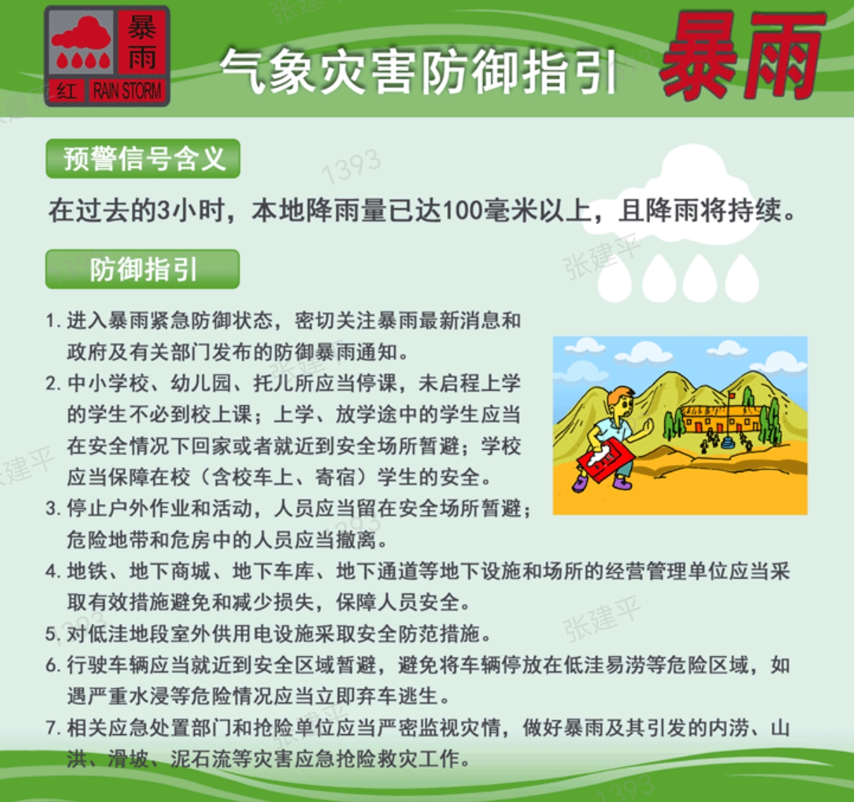 暴雨預(yù)警升級為紅色時,中小學(xué)校、幼兒園、托兒所應(yīng)當(dāng)停課,未啟程上學(xué)的學(xué)生不必到校上課;上學(xué)、放學(xué)途中的學(xué)生應(yīng)當(dāng)在安全情況下回家或者就近到安全場所暫避;學(xué)校應(yīng)當(dāng)保障在校(含校車上、寄宿)學(xué)生的安全。停止戶外作業(yè)和活動,人員應(yīng)當(dāng)留在安全場所暫避;危險地帶和危房中的人員應(yīng)當(dāng)撤離。地鐵、地下商城、地下車庫、地下通道等地下設(shè)施和場所的經(jīng)營管理單位應(yīng)當(dāng)采取有效措施避免和減少損失,保障人員安全。行駛車輛應(yīng)當(dāng)就近到安全區(qū)域暫避,避免將車輛停放在低洼易澇等危險區(qū)域,如遇嚴重水浸等危險情況應(yīng)當(dāng)立即棄車逃生。
