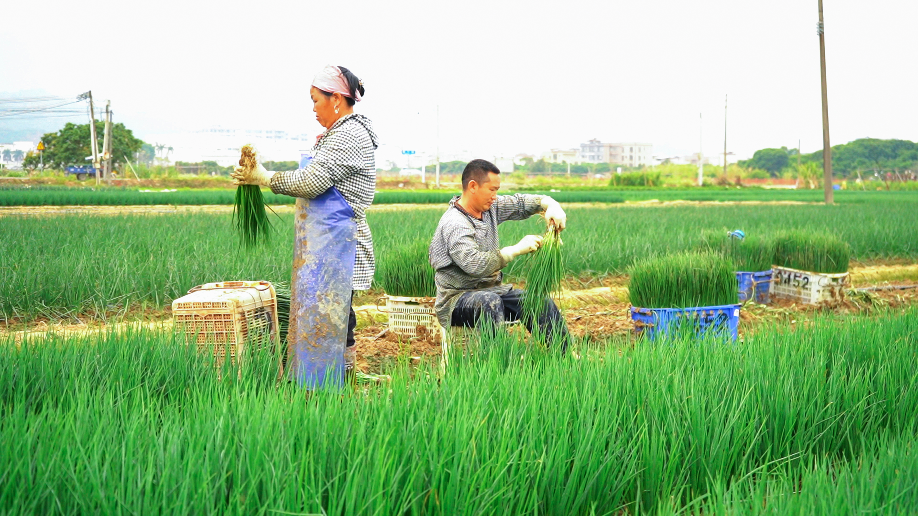 轉機始于2023年。這一年,泮瀝村塘下紅頭蔥合作社正式掛牌,220畝零散土地被整合起來,標準化灌溉系統(tǒng)架進了田間,由合作社統(tǒng)一管理技術、肥料和銷售,并邀請專家指導稻蔥輪作,實現(xiàn)“越種越肥”的生態(tài)循環(huán)!按寮w+合作社+農戶”的模式,讓像鐘伯一樣的農戶嘗到了“抱團發(fā)展”的甜頭。當年,紅頭蔥產(chǎn)量突破200萬斤,可新的難題又找上門——沒渠道、沒銷路,豐收的蔥依然面臨滯銷風險。