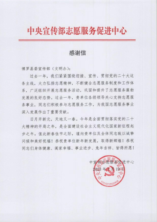 1月19日,中宣部志愿服務(wù)促進(jìn)中心給博羅縣委宣傳部(文明辦)發(fā)來感謝信,感謝該縣志愿服務(wù)組織和志愿者們,在過去一年里,為博羅縣志愿服務(wù)事業(yè)深入發(fā)展作出的重要貢獻(xiàn)。在兔年春節(jié)之際,為全縣志愿者鼓足了干勁,為博羅志愿服務(wù)事業(yè)注入新動力。據(jù)悉,在過去一年里,在中央和省市的統(tǒng)籌指導(dǎo)下,在縣委、縣政府的正確領(lǐng)導(dǎo)下,博羅縣志愿服務(wù)工作緊緊圍繞中心、服務(wù)大局,有效對接百姓民生,積極融入生產(chǎn)生活,扎實(shí)推動志愿服務(wù)活動在博羅大地廣泛開展。
