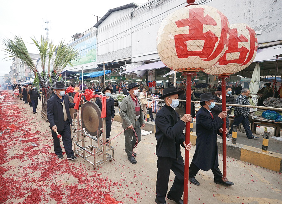 “接燈”的隊伍敲著鑼鼓,舞著獅子,放著鞭炮。