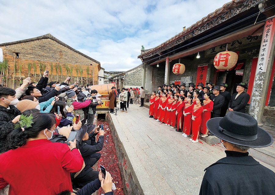 記者在現(xiàn)場看到,當天,當年添丁的媳婦挑著籮筐跟隨在隊伍中去上燈,婆婆和妯娌也加入到了其中,裝有物品的籮筐有些重,婆婆、妯娌為媳婦分擔一路的勞累,相互接力,互換著挑起籮筐,也接力挑起了家庭的擔子,體現(xiàn)出濃濃的婆媳、妯娌和睦持家的情義。沿途各姓氏上燈、巡游的隊伍在街頭相逢,還會相互問候祝福。