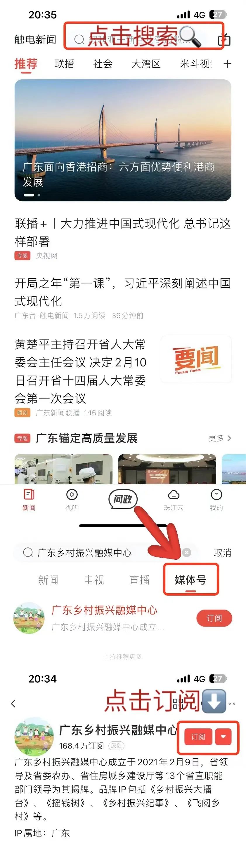 ①在“觸電新聞”APP里搜索?并訂閱【廣東鄉(xiāng)村振興融媒中心】觸電號(hào)
