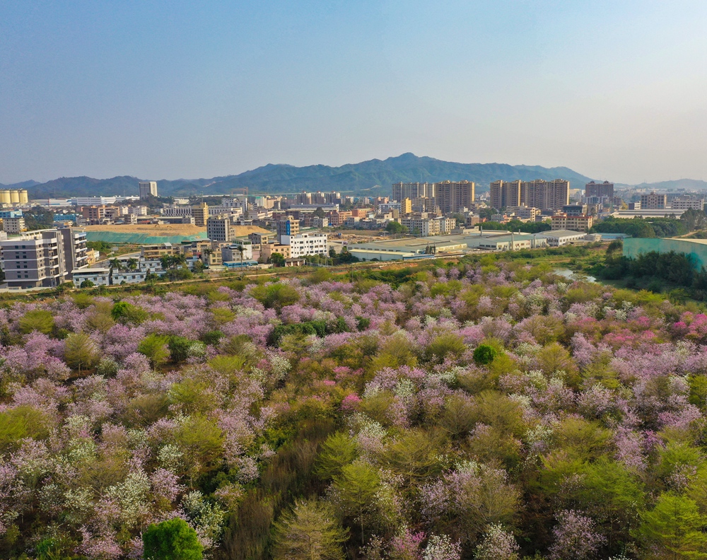 舉目望去,粉紅色的花海盛開在象頭山下、泰美鎮(zhèn)旁,構(gòu)成了一幅鄉(xiāng)村振興的美麗畫卷。
