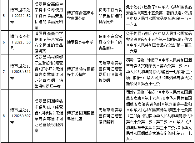 食品安全關(guān)乎老百姓的日常生活,也是惠州市場監(jiān)管部門維護(hù)市場秩序,督導(dǎo)檢查的重點(diǎn)。近日,恰逢“3·15”國際消費(fèi)者權(quán)益日周期,惠州市博羅縣市場監(jiān)督管理局發(fā)布了轄區(qū)《2023年行政處罰信息公開表》,博羅縣羅陽街道樂沙日用百貨店、博羅綜合高級中學(xué)有限公司等9家企業(yè)及經(jīng)營單位均涉嫌違法被立案查處。