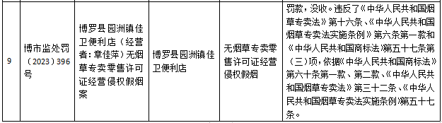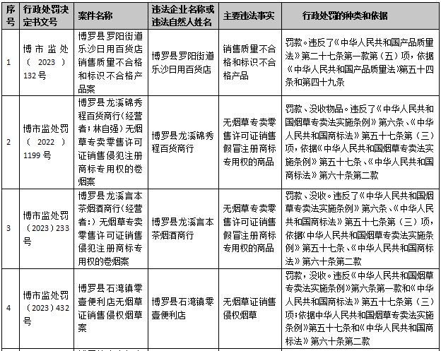而博羅縣龍溪錦秀程百貨商行、博羅縣龍溪言本茶煙酒商行、博羅縣石灣鎮(zhèn)零壹便利店、博羅縣楊村鎮(zhèn)都好生活超市、博羅縣園洲鎮(zhèn)榅洋便利店、博羅縣園洲鎮(zhèn)佳衛(wèi)便利店等6家便利店和商行的違規(guī)行為均集中于無煙草專賣零售許可證經(jīng)營卷煙侵權(quán)行為,且部分商行還被查出銷售侵權(quán)煙草和經(jīng)營侵權(quán)假煙等行為,均被市場監(jiān)管部門依法予以罰款和沒收違法所得。