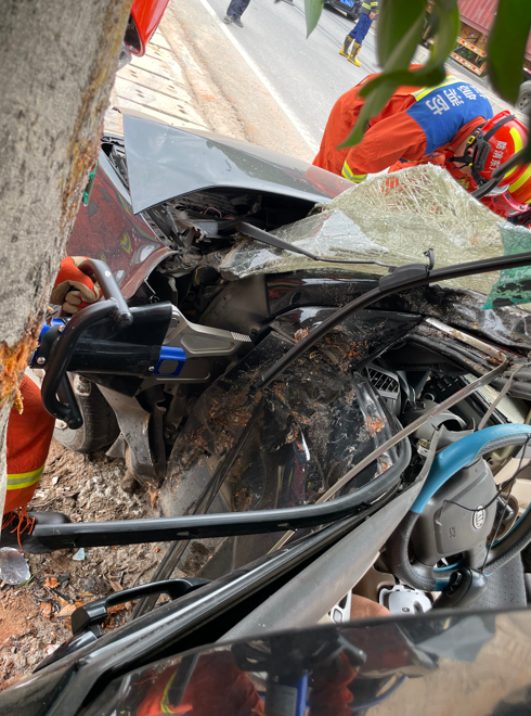 其中小轎車的主駕駛室及車門因兩次撞擊導(dǎo)致嚴重變形,車主雙腿被卡在駕駛室無法動彈,情況十分危急。