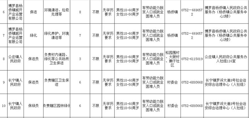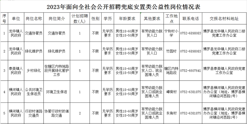 為加強鄉(xiāng)村公共就業(yè)服務隊伍建設,夯實鄉(xiāng)村振興人才支撐,大力推動兜底安置類公益性崗位(含鄉(xiāng)村公益性崗位)開發(fā),根據(jù)《廣東省人力資源和社會保障廳 廣東省財政廳關于修訂印發(fā)<廣東省兜底安置類公益性崗位開發(fā)管理辦法>的通知》(粵人社規(guī)〔2020〕13號)和市人社局《關于做好惠州市2023年兜底安置類公益性崗位開發(fā)工作的通知》(惠市人社函〔2023〕144號)文件要求,結合博羅縣工作實際,現(xiàn)將公益性崗位公開招聘有關事項公告如下: