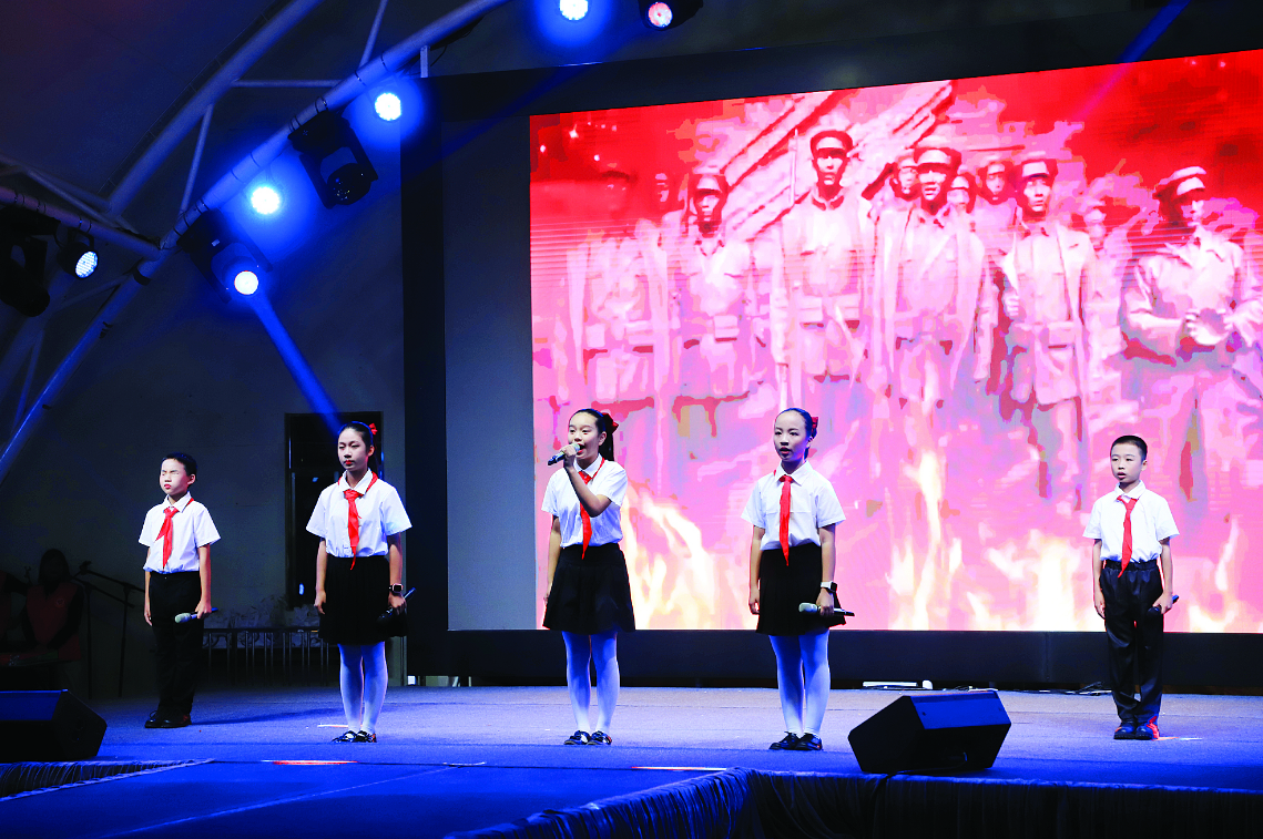 悠揚(yáng)的曲調(diào),優(yōu)美的舞姿,營造了一種相對放松的氛圍,自然而然地將大家?guī)氲叫v者的情景設(shè)計(jì)中。開場的宣講節(jié)目舞蹈《我心中的河》令人眼前一亮。這個(gè)宣講節(jié)目由小朋友擔(dān)綱,他們用自己的理解把對革命前輩的敬意融入舞蹈中。他們將革命精神記心中,把“少年智則國智,少年強(qiáng)則國強(qiáng)”和“強(qiáng)國有我”傳遞給現(xiàn)場觀眾,帶給大家滿滿的感動(dòng)。