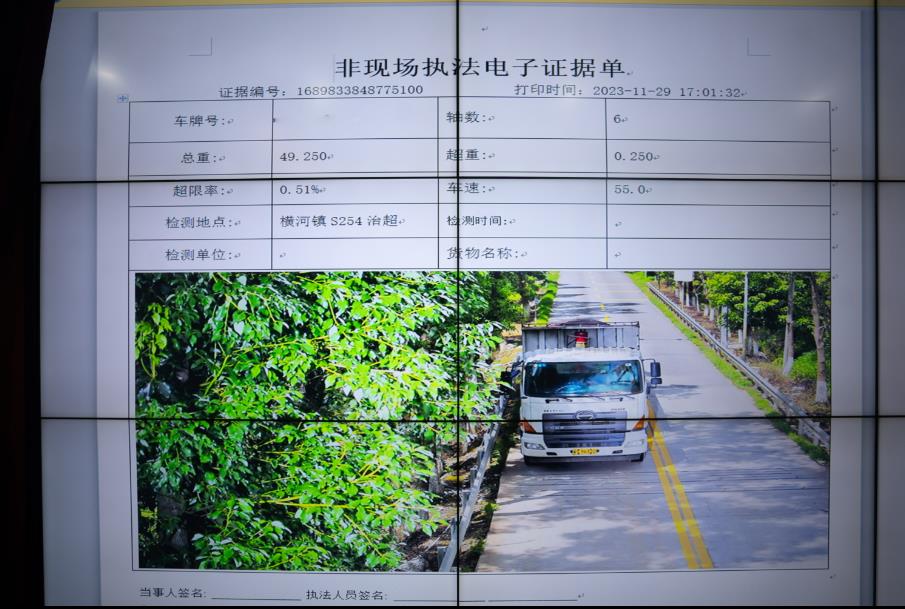 治超非現(xiàn)場執(zhí)法項目搭建了動態(tài)監(jiān)測、稱重、信息發(fā)布等系統(tǒng),自動檢測通過的貨運車輛,生成非現(xiàn)場執(zhí)法單據(jù),并推送至終端大屏。