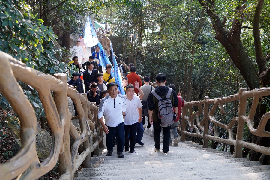 登山不到羅浮巔,舉足萬里空徒然。活動全體參與人員以方隊為單位,邁著矯健的步伐沿著登山線路從索道上站臺、鷹嘴巖、登山門、朝真石、燕巖頂、云峰巖、分水坳直至飛云頂,在迷人景色中登山祈福健身。