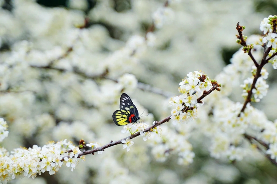五顏六色的蝴蝶在花叢中飛舞,裝點(diǎn)著這一片雪白的花海。