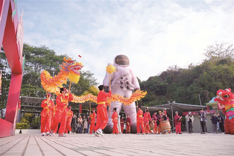 近日,在廣東航天農(nóng)業(yè)科技生態(tài)園,以“龍年龘龘”為主題的新春嘉年華活動(dòng),已經(jīng)在園內(nèi)預(yù)演!斑诉绥I,咚咚鏘……”響亮的鑼鼓聲提前為游客營(yíng)造春節(jié)氛圍。在科技園門口,一條金龍、一頭紅獅在鑼鼓聲中舞動(dòng)起來(lái),活靈活現(xiàn),節(jié)日喜慶氛圍滿滿。