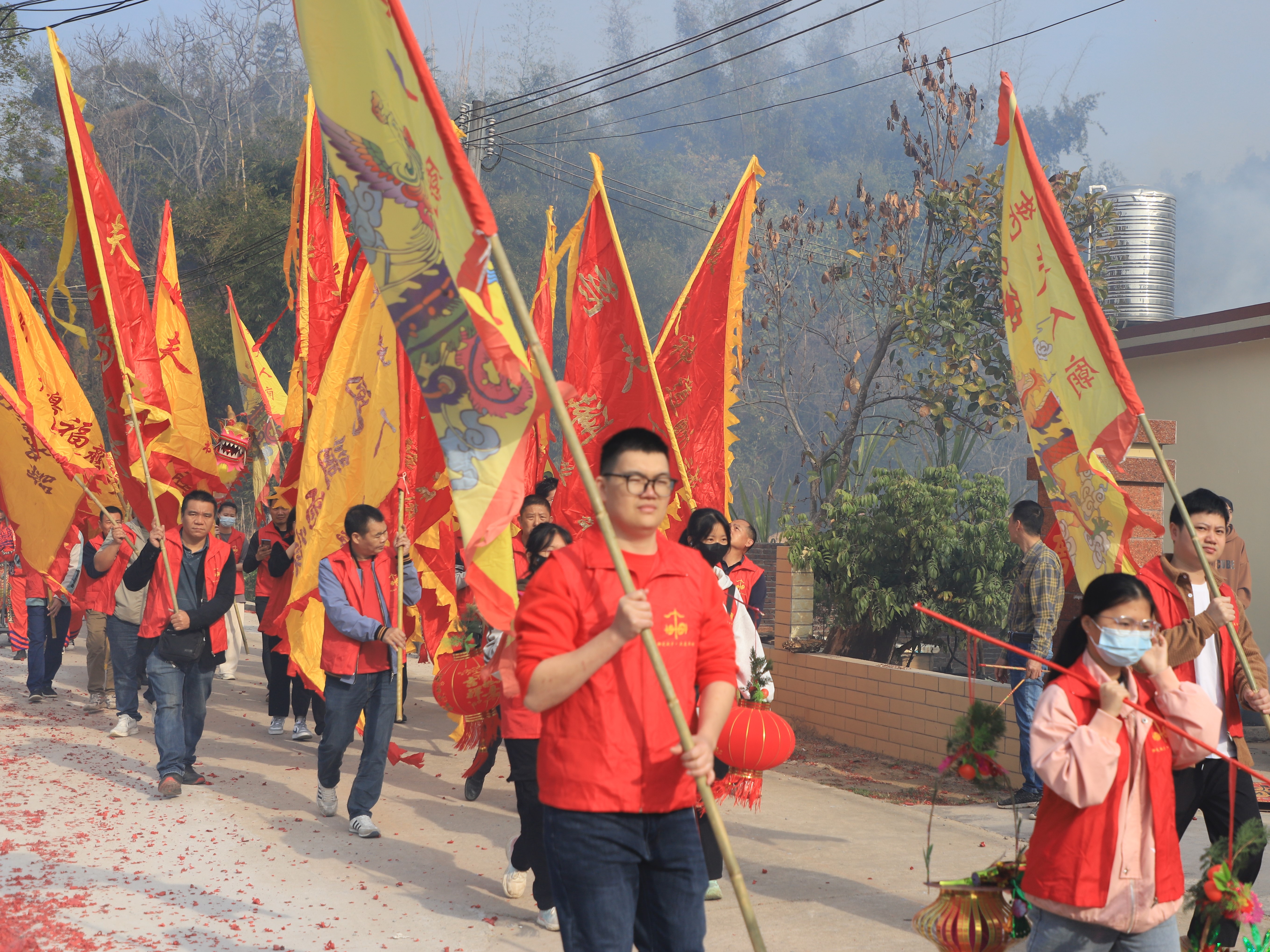 早上9時,巡游正式開始。姚夫人的大黃旗先行,緊接著是拉橫幅的隊伍,之后便是姚夫人的花轎;ㄞI后面是舉旗的、抬花的、舞龍的、女子醒獅隊……巡游隊伍由行宮隊、錦旗隊、醒獅隊、禮炮隊、鼓樂隊及民眾自發(fā)加入的隊伍組成,由姚夫人廟出發(fā),繞村行走,祈求平安健康、風(fēng)調(diào)雨順、國泰民安。