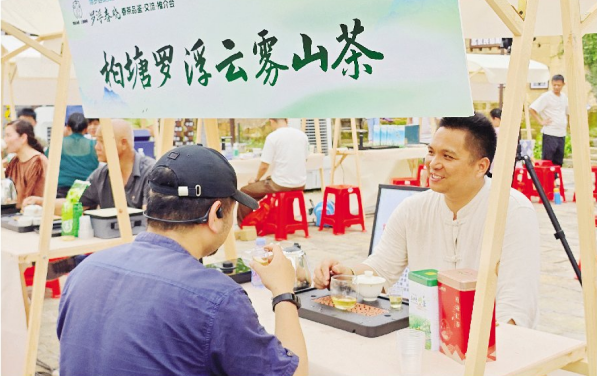 “這個綠茶的味道帶有花香,味道很特別,快來嘗一口!痹谔┟缻棺滩鑸@的攤位上,來自惠城區(qū)的游客李女士喝了一口茶后向同伴分享道。在春茶品鑒環(huán)節(jié),來自博羅縣各地20家茶農(nóng)茶商代表紛紛拿出自家的“寶貝”與大家分享、交流,F(xiàn)場茶藝師們煮水烹茶,通過精湛的泡茶技藝,將茶葉泡成香氣四溢的佳品,供茶友品嘗,F(xiàn)場氛圍熱烈,交談甚歡,這一邊,茶農(nóng)茶商們向大家介紹自家茶葉的品質(zhì)、特點;另一邊,追隨茶香而來的茶友們,輪番到各個展位上品茶,賞茶葉、品茶湯、聞茶香,感受每款茶不同的風(fēng)味,感受茶文化的魅力。