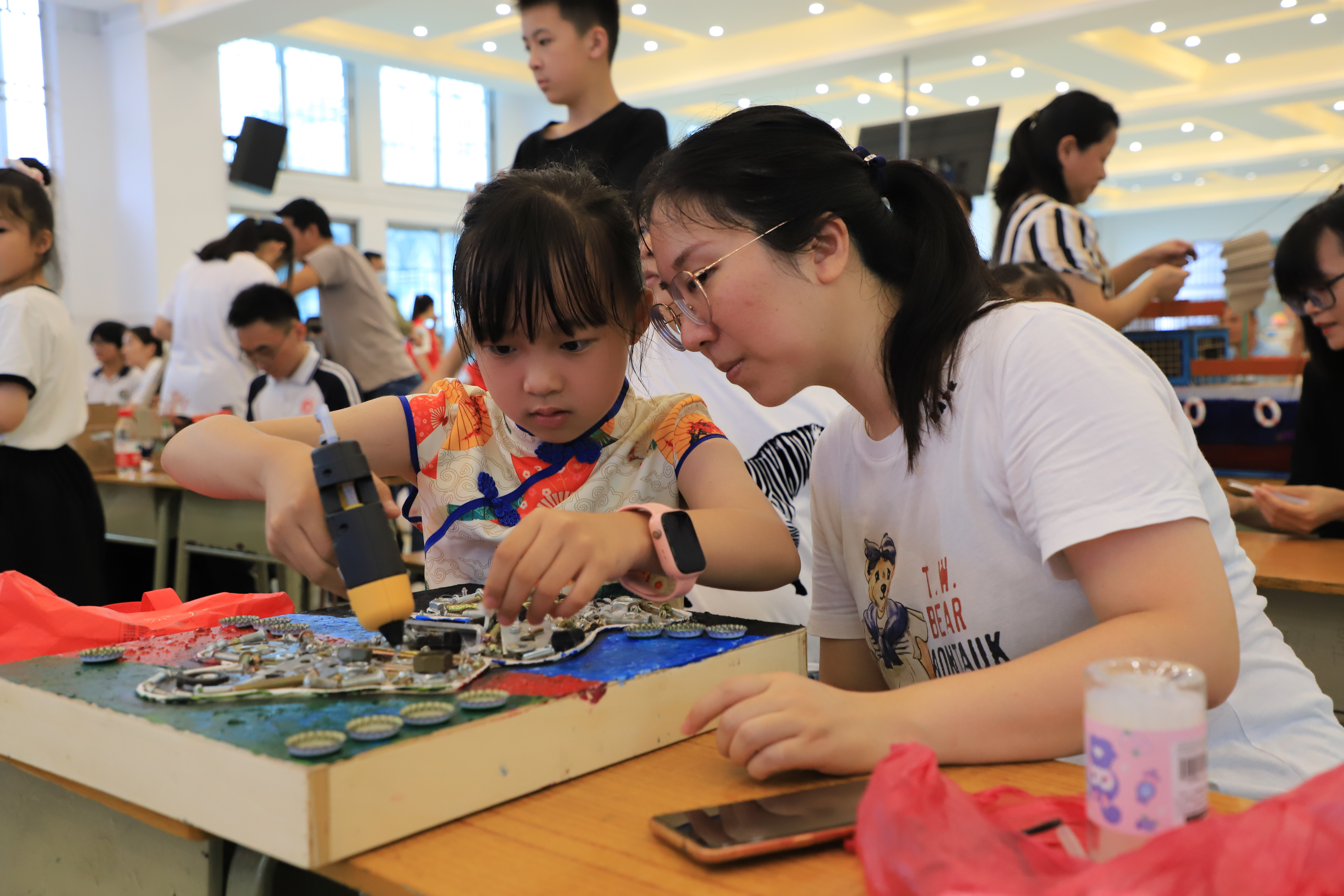 老師指導(dǎo)學(xué)生制作垃圾分類(lèi)宣傳作品。