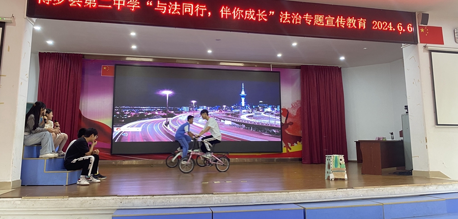 由博羅縣人民法院根據(jù)真實案件改編的普法情景劇,融入了未成年人、飆車“炸街”、校園貸等元素,劇中設(shè)置的誤入歧途的少年、社會青年、飆車人等角色均由博羅縣第二中學(xué)的學(xué)生演繹。鮮活的情景劇激活了同學(xué)們的學(xué)法熱情,參與演繹的同學(xué)紛紛表示,通過角色代入引起了自身思考,校園貸和飆車等這些行為不能有、不能碰。在臺下觀看情景劇的學(xué)生小黃也深受教育:“要把心思放在學(xué)習(xí)這些正事上,才能不被誘惑!