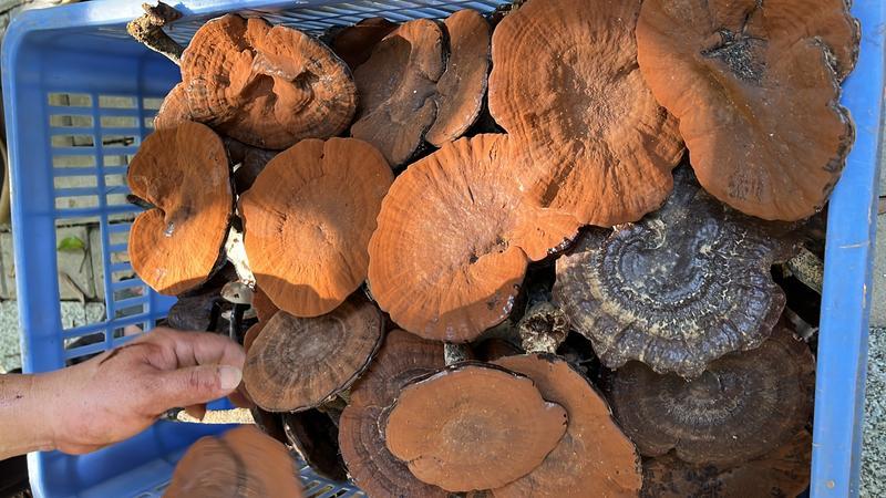 林永標介紹,成熟的紫靈芝,從外觀上看,菌蓋周邊變黑、肉質(zhì)厚,菌蓋底部由白色轉(zhuǎn)為咖啡色或深褐色,表面可見金黃的孢子粉,質(zhì)感硬實。無論是野生的還是人工種植的靈芝,都是3個多月的生長期!皬乃幱脙r值上來看,這種仿野生的靈芝和野生靈芝沒有什么區(qū)別!绷钟罉讼虼蠹铱破盏,野生靈芝被采摘時還未成熟或者已老化,實際上藥用價值已大打折扣;而人工仿野生的靈芝,在成熟度剛好的時候采摘,可以大大地保留其藥用、食用價值和香味。