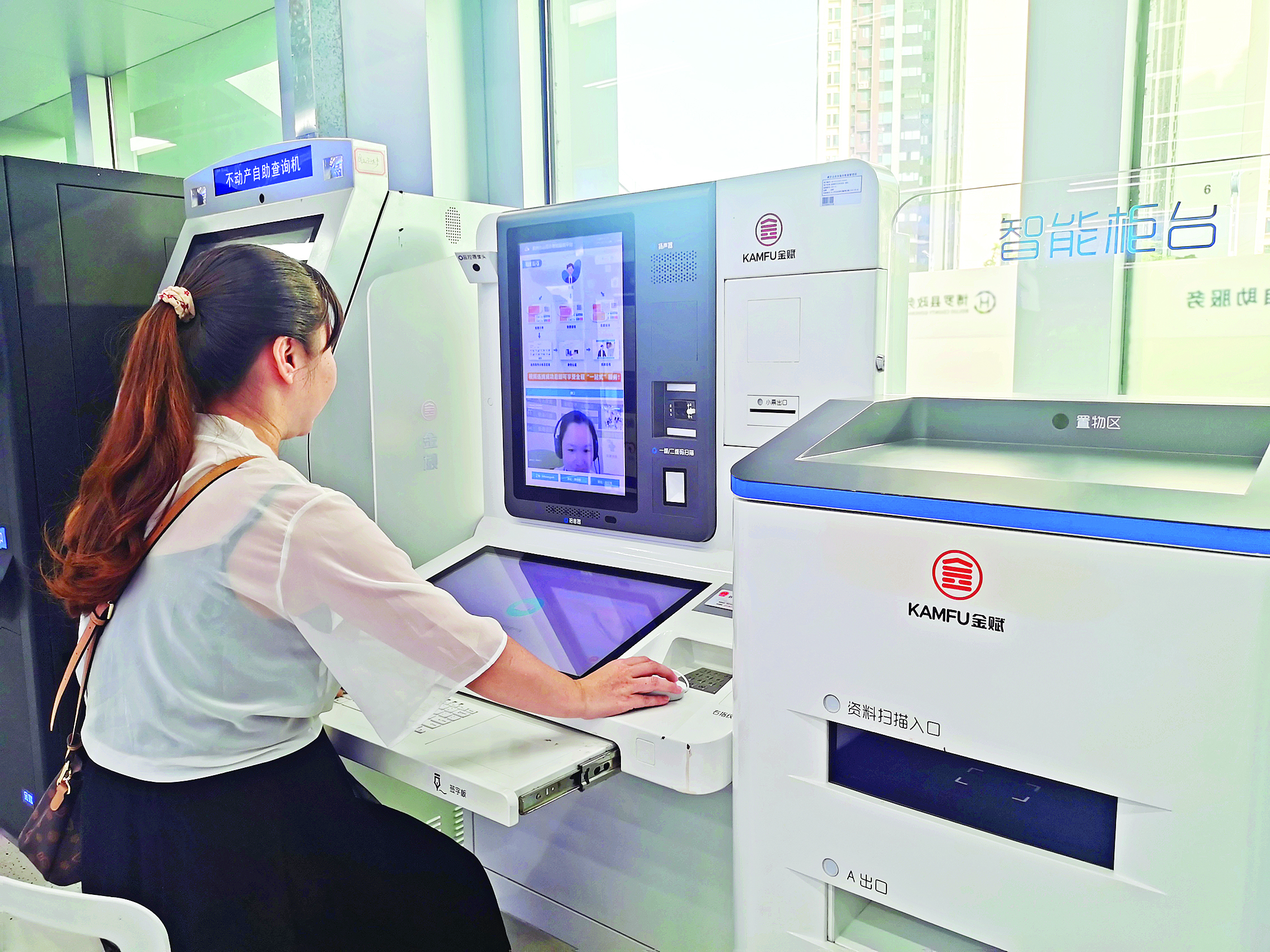 市民通過智能柜臺與工作人員遠程視頻辦理業(yè)務。