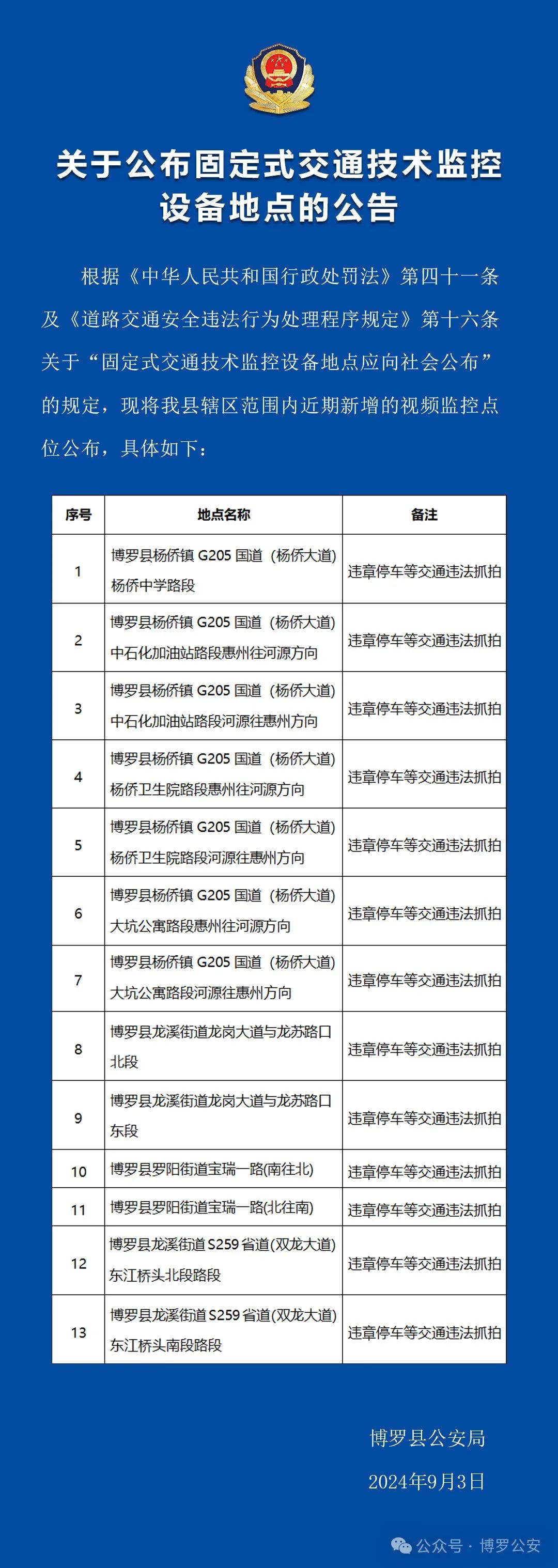 《關(guān)于公布固定式交通技術(shù)監(jiān)控設(shè)備地點(diǎn)的公告》