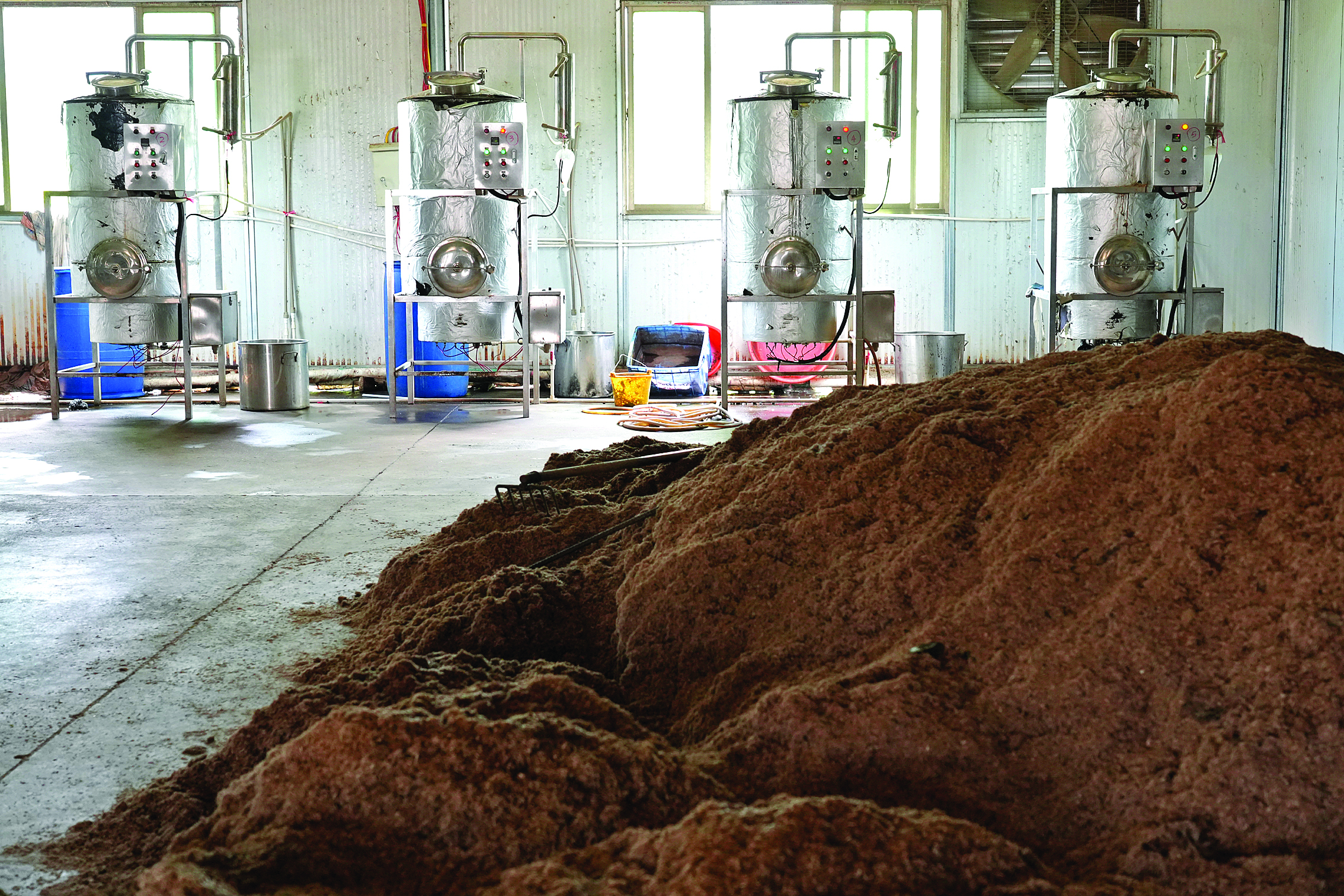 山腳下的生產(chǎn)車間內(nèi),層層堆疊著剛砍下不久的沉香樹干,工人們忙著對(duì)樹干進(jìn)行切割、破裂。另一頭的加工車間內(nèi),沉香碎屑如小山丘,空氣中彌漫著陣陣濃郁的沉香木屑味,一旁的自動(dòng)化機(jī)械設(shè)備不停運(yùn)轉(zhuǎn),經(jīng)過幾十個(gè)小時(shí)后,沉香碎屑將蛻變成晶瑩剔透的沉香純露,或被加工成香氣濃郁、色澤醇厚的沉香精油。