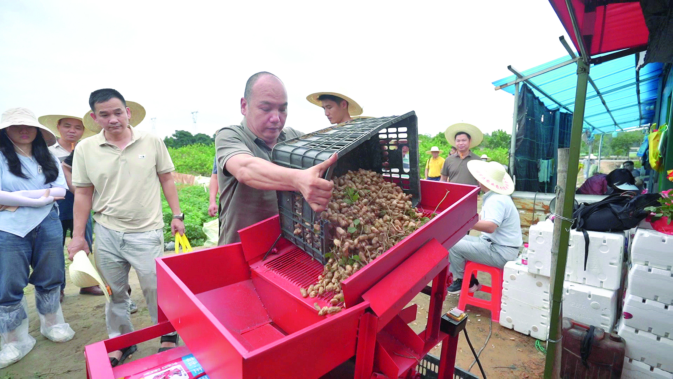 “這是花生剝殼機(jī),晾干后的花生可以在此剝殼,還可以根據(jù)果實(shí)的大小進(jìn)行初步分篩。”在一旁的田埂上,博羅縣農(nóng)業(yè)農(nóng)村綜合服務(wù)中心高級(jí)農(nóng)藝師林力夫正為與會(huì)人員講解示范花生剝殼機(jī)等農(nóng)機(jī)的功能、原理與優(yōu)勢(shì)。
