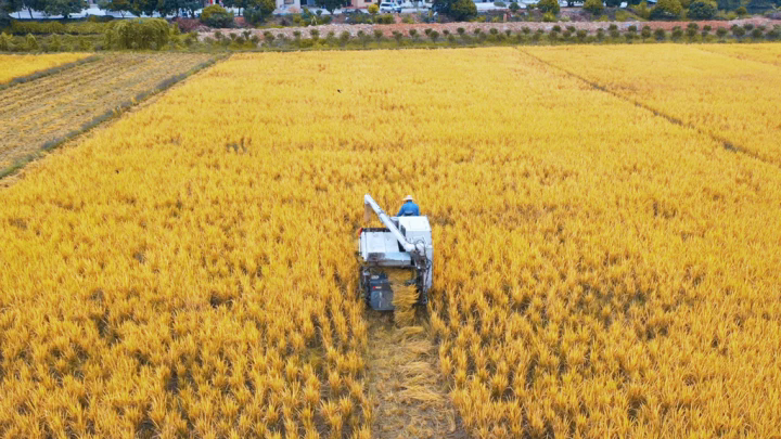 伴隨著機器的轟鳴聲,農(nóng)機手們駕駛著收割機在稻田中來回穿梭。一卷、一割間,金黃的稻谷就被“盡收囊中”,割稻、脫粒、粉碎秸稈等過程一氣呵成。