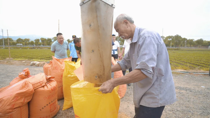 十余分鐘后,滿載的收割機緩緩?fù)T谔锕∵吷,金黃的稻谷隨著收割機的管道傾瀉而下,農(nóng)戶們在道路旁忙著裝袋、打包。一個個裝滿水稻的麻袋在田埂上“整齊列隊”,大家的臉上洋溢著豐收的喜悅。