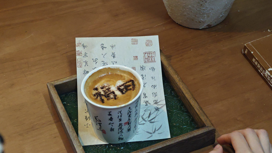 “您點(diǎn)的咖啡和茶點(diǎn)來(lái)了!闭勑β暸c快門(mén)聲之間,不急茶舍老板李文居端著兩杯咖啡走了進(jìn)來(lái)。杯面上寫(xiě)有福田二字的咖啡拉花與形似柿子的水果的糕點(diǎn),引來(lái)游客陣陣贊嘆與多臺(tái)相機(jī)的聚焦。