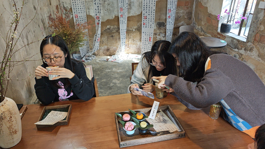 穿過(guò)院子步入客廳,幾位游客正圍著茶臺(tái)品茶、漫談。經(jīng)過(guò)修繕的老墻上,掛著書(shū)法作品、竹木掛簾以及數(shù)件供游客拍照的漢服。房間內(nèi),兩名游客正在聚光燈下拍照打卡,記錄當(dāng)下的美好。