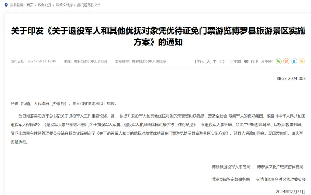 現(xiàn)役軍人憑有效證件;殘疾軍人憑《中華人民共和國(guó)殘疾軍人證》或《中華人民共和國(guó)退役軍人優(yōu)待證》;退役軍人憑《中華人民共和國(guó)退役軍人優(yōu)待證》;軍隊(duì)文職人員憑《中國(guó)人民解放軍文職人員證》;烈士遺屬、因公犧牲軍人遺屬、病故軍人遺屬憑《中華人民共和國(guó)烈士、因公犧牲軍人、病故軍人遺屬優(yōu)待證》,免首道門票優(yōu)先進(jìn)入博羅縣旅游景區(qū)游覽。