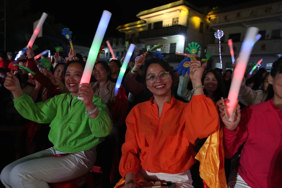 博羅縣青年歌唱家劉維與畬族生活習(xí)俗文化傳承人雷金球、嶂背畬族村孩童雷德權(quán)共同用畬語(yǔ)演唱村歌《畬寨傳喜訊》,以老中青三代人的畬語(yǔ)演繹,體現(xiàn)畬族文化傳承。村歌聯(lián)排節(jié)目更是把現(xiàn)場(chǎng)氣氛推向高潮,來(lái)自湖鎮(zhèn)鎮(zhèn)新圍村的《神山石下幸福村》、楊村鎮(zhèn)水華寨村的《幸福水華寨》、羅陽(yáng)街道觀背村的《觀背開(kāi)心迎客來(lái)》、橫河鎮(zhèn)西群村的《竹海西群》、園洲鎮(zhèn)下南村的《羅浮影》五個(gè)方隊(duì),村民們各展才藝,吹拉彈唱、相互拉歌,臺(tái)上臺(tái)下、男女老少,其樂(lè)融融,展現(xiàn)出鄉(xiāng)村的蓬勃朝氣與村民的幸福生活,濃濃的年味彌漫在每一個(gè)角落。