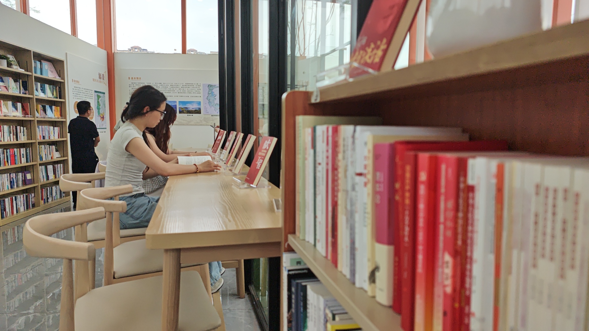 記者在現(xiàn)場(chǎng)看到,閱讀空間周邊環(huán)境宜人,小河潺潺,岸邊草木蔥蘢,鳥語花香,為閱讀空間增添了一份寧靜與愜意。落地玻璃前,原木色調(diào)的長(zhǎng)桌整齊擺放,陽光透過玻璃灑在桌面上,營(yíng)造出舒適的閱讀氛圍。