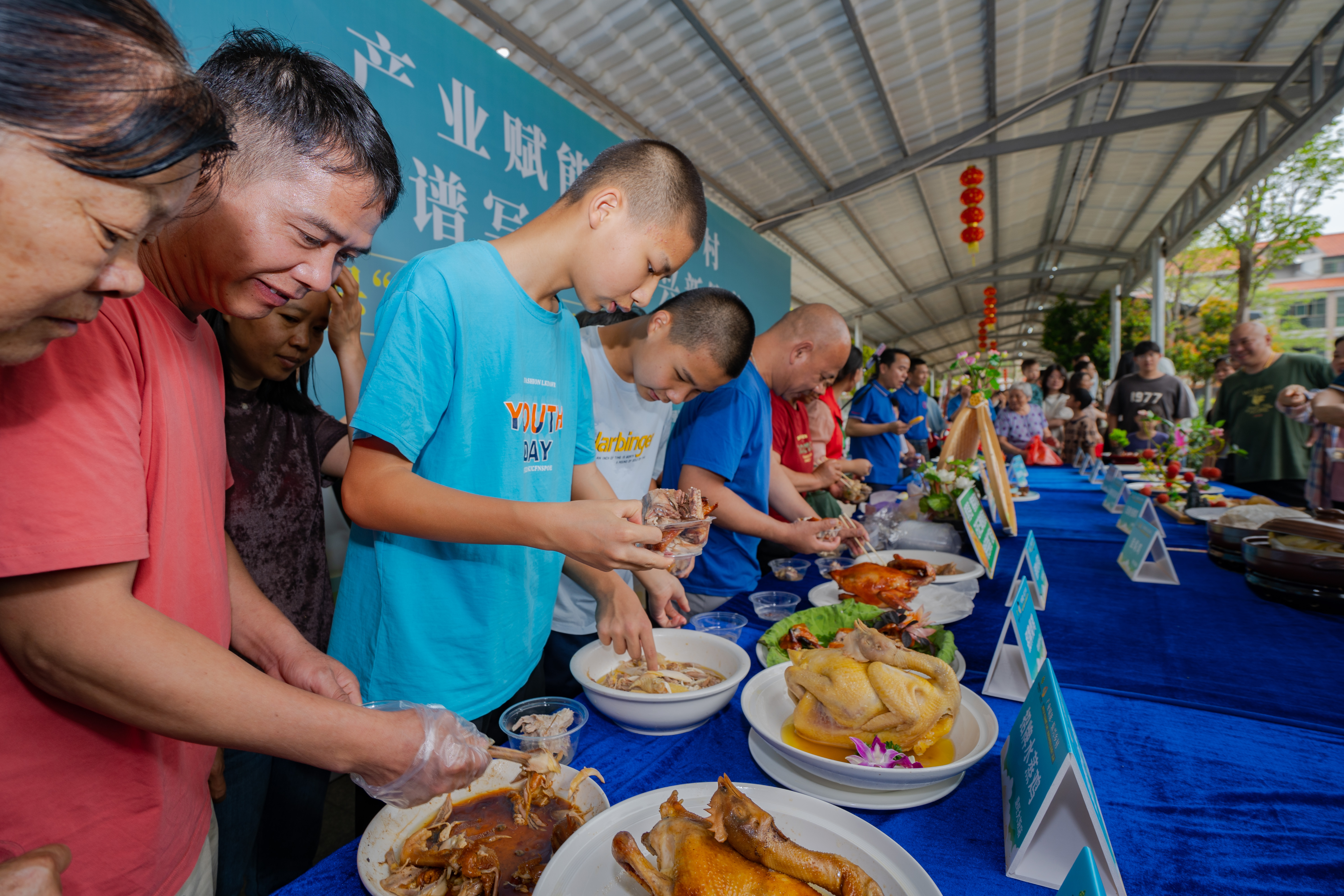 當(dāng)天,“雞”祥如意游園會成為人氣焦點。文化展示區(qū)通過圖文展板系統(tǒng)呈現(xiàn)三黃胡須雞的養(yǎng)殖歷史、嶺南農(nóng)耕文化脈絡(luò)及現(xiàn)代產(chǎn)業(yè)升級路徑,讓群眾與企業(yè)代表清晰感知產(chǎn)業(yè)發(fā)展脈絡(luò);企業(yè)展銷區(qū)匯聚當(dāng)?shù)佚堫^企業(yè),現(xiàn)場展示雞蛋、蛋卷、鹽焗雞等多種產(chǎn)品,搭建起產(chǎn)銷對接通道;美食廚藝區(qū)邀請10家本地餐飲單位以三黃胡須雞為主材,現(xiàn)場烹制白切雞、松露脆皮雞、菊花撈雞等經(jīng)典與創(chuàng)新菜品,展現(xiàn)石壩三黃胡須雞的多元烹飪可能。