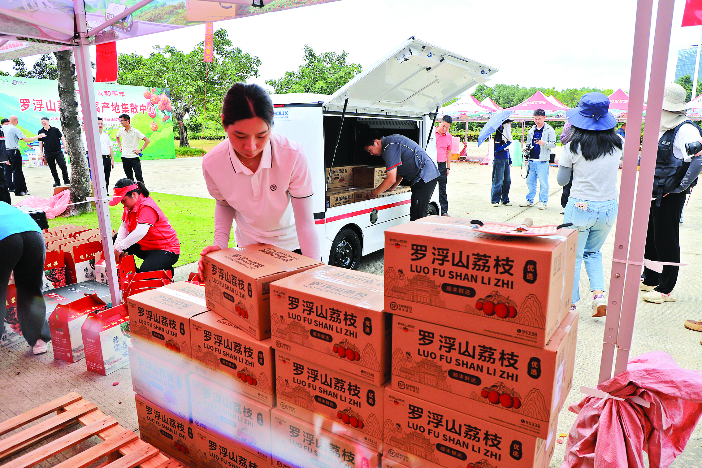 工作人員將荔枝搬上無人車。 惠州日報記者李燕文 盧泓宇 攝