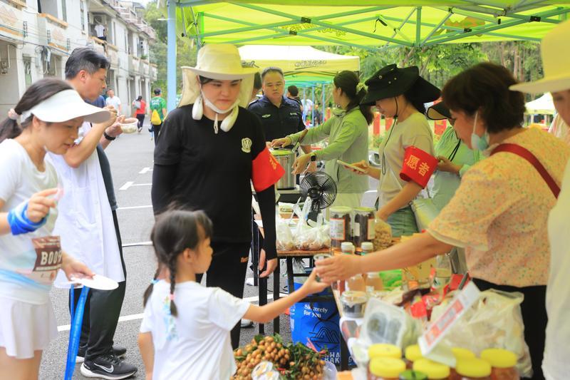 “綠行山野”徒步活動出發(fā)點設(shè)了農(nóng)產(chǎn)品展區(qū)。每個展位前人頭攢動,大家品嘗當(dāng)?shù)靥禺a(chǎn)麻陂肉丸、蜂蜜、即食酸菜等。品嘗之余,戶外運動愛好者們還紛紛購買,打算帶回家和親朋好友一起品嘗。