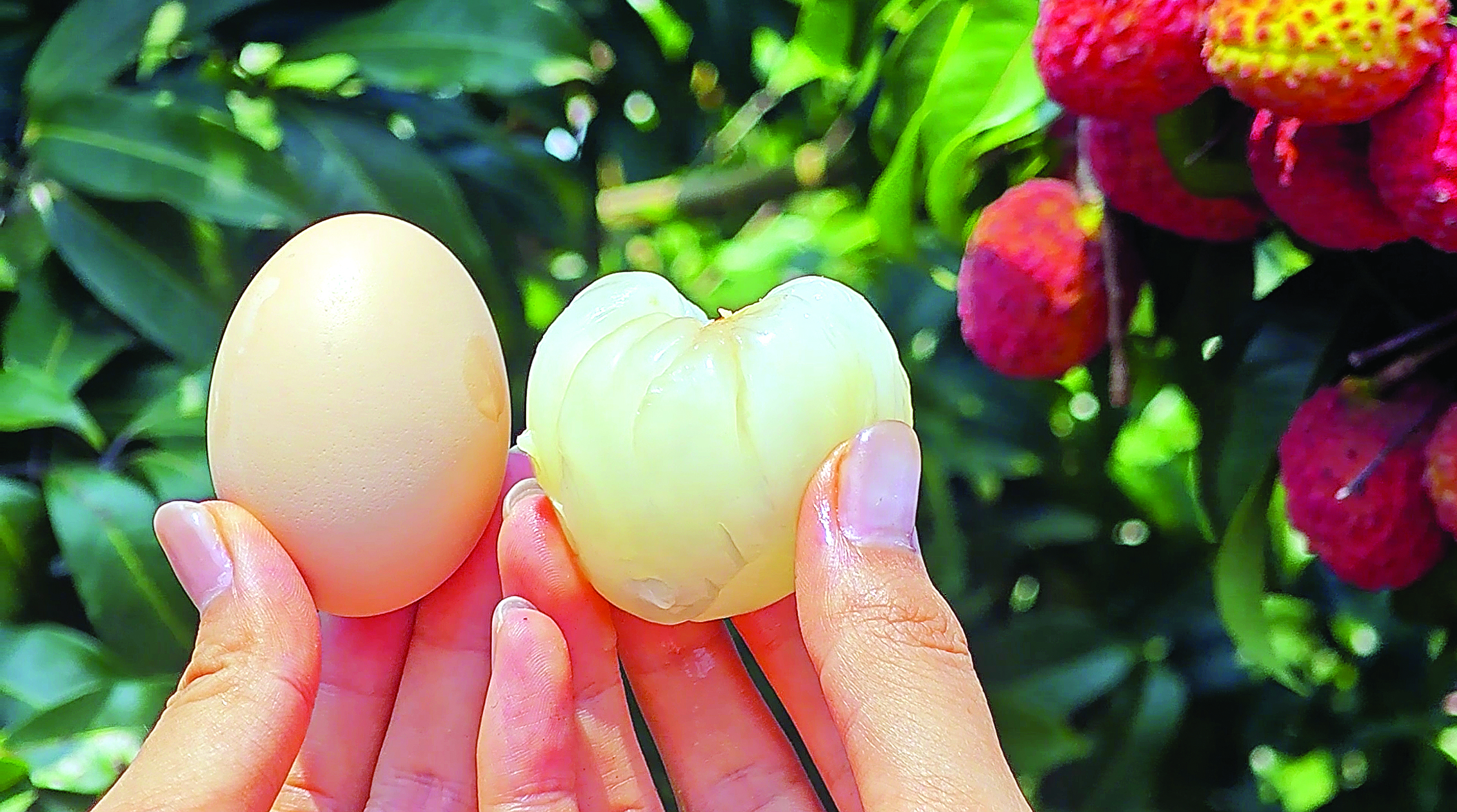 走進合作社的種植區(qū),漫山遍野的荔枝樹枝繁葉茂,枝頭垂掛著簇簇飽滿的荔枝,顆顆渾圓如紅寶石!澳憧催@顆無核荔枝,表皮的‘縫合線’夠白了,說明已經(jīng)成熟可以采摘了!焙献魃缲撠熑岁悅デ咫S手摘下一顆雞蛋大小的無核荔枝,剝開后只見果肉晶瑩飽滿,入口爽脆清甜、果香濃郁,讓人回味無窮。