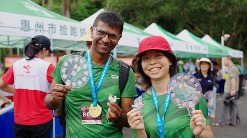 有了兩位“小網(wǎng)紅”的助力,選手們參與環(huán);顒(dòng)的熱情更加高漲了。大家將垃圾帶回終點(diǎn)后,迫不及待地領(lǐng)取文創(chuàng)產(chǎn)品。來自澳大利亞的Ravi Sundar第一次在中國參加這么大型的徒步活動(dòng),在領(lǐng)到“游游”“玩玩”的文創(chuàng)產(chǎn)品后,他開心地與女朋友拍照留念:“這個(gè)公仔形象很可愛。”