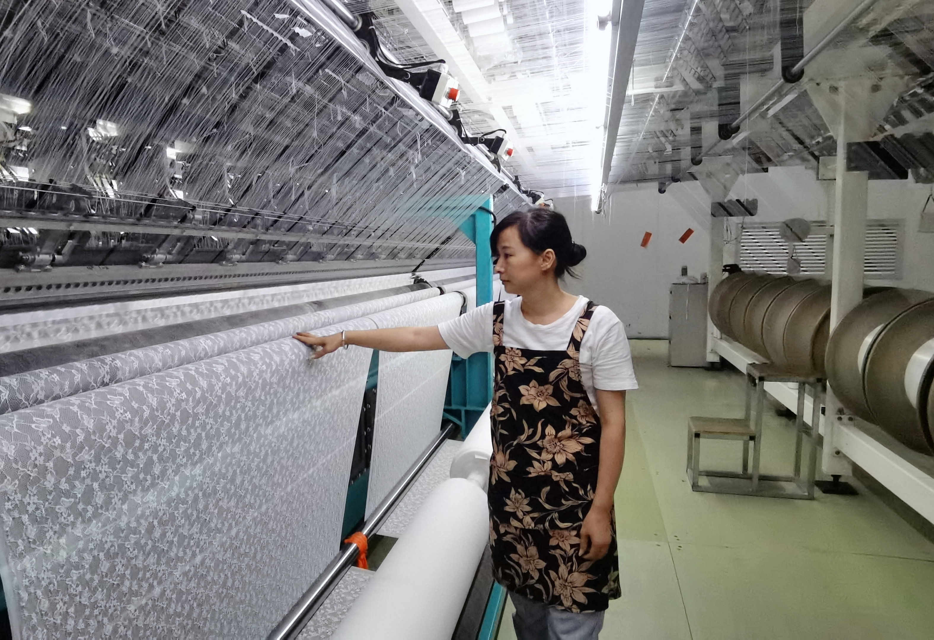 位于園洲鎮(zhèn)的廣東中康織繡科技有限公司生產(chǎn)車間里,工人正檢查蕾絲生產(chǎn)情況。惠州日?qǐng)?bào)記者朱麗婷 攝